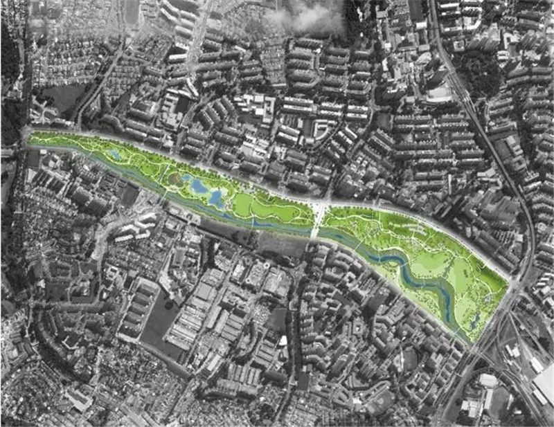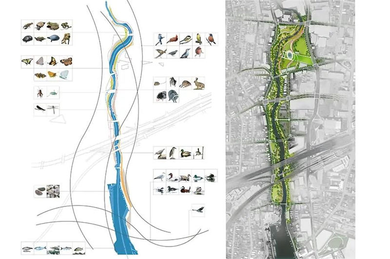 該方案在一個泛濫平原理念的基礎(chǔ)上設(shè)計,當(dāng)水位低時,人們能夠在寬闊的河岸沿線親近水、享受休閑活動,而在暴雨時期,河流附近的公園綠地成為一條運輸線路,運送下游的水流,在公園內(nèi)進行多種土地利用,為公共活動建造出更多的空間。
