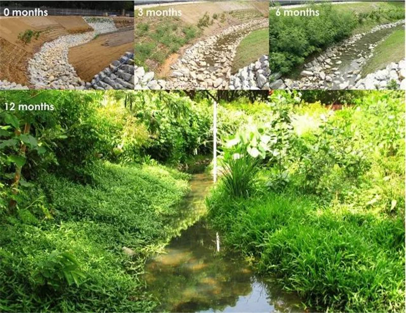 新河岸建成一年,景觀效果非常令人吃驚。河水流動沖刷了各種礫石、砂礫。河流的輪廓很清晰,但是河岸景觀的設(shè)計是非常自由的。